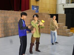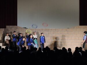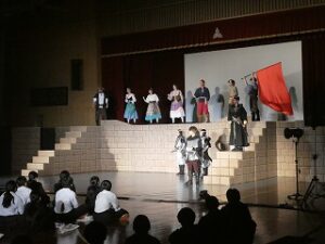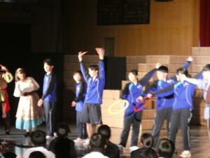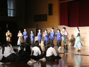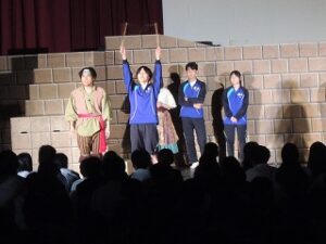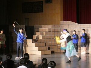 内容は、劇団ショーマンシップによるミュージカル「ノートルダム物語」でした。プロの演じるステージに、生徒たちは引き込まれていきました。途中で、本校生徒もステージに参加し、事前練習の成果を発揮し、見事に技を決めたり、役者さんと一緒に演技をしたりして観客を楽しませてくれました。