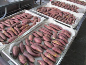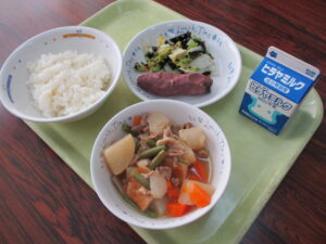 肌寒くなってきて、献立の内容にも冬らしさが感じられるようになりました。今日は給食室のオーブンで焼き芋を焼きました。今日使ったさつまいもは、先月2年生が職場体験でお世話になった弥栄町のビオラビッツから届いたものです。給食にちょうど良い小ぶりのさつまいもを届けていただき、丸ごと焼いて1人1本付けました。さつまいもの甘みを出すために低温でじっくり焼いた焼き芋。生徒も「すごく甘かった!」「砂糖が入ってるみたい」と自然の甘さに驚き、とても喜んで食べていました。
