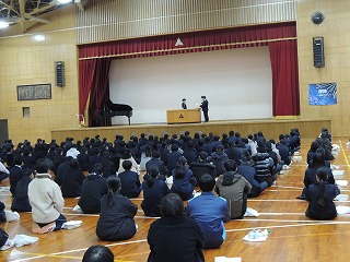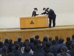 学校の様子税務署主催の「税についての作文」で3年生の生徒が「近畿税理士会峰山支部支部長賞」を受賞しました。その伝達表彰を終業式に先立ち実施しました。