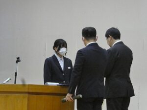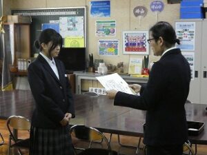 税務署主催の「税についての作文」で3年生の生徒が「近畿税理士会峰山支部支部長賞」を受賞しました。その伝達表彰を終業式に先立ち実施しました。