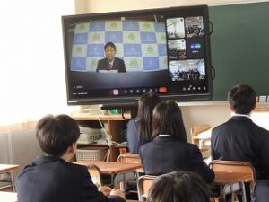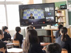 3学期が始まり始業式をオンラインで実施しました。生徒たちは慣れた様子で校歌を斉唱し、校長式辞を真剣に聞いていました。