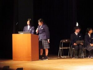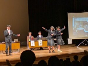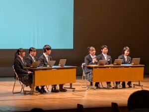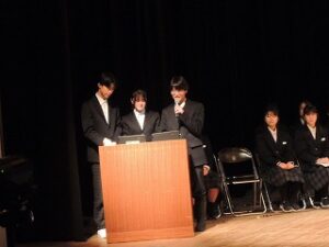 「出かけよう!未来の自分探究の旅へ!!」~直接体験からグローバル社会へ~というキャッチフレーズのもと、中学2、3年生の代表が、「京丹後市を活性化するためのプロジェクト」など、これまでの取組や体験で学んだこと、考えたこと、まとめたことについて発表したり、パネルディスカッションしたりしました。