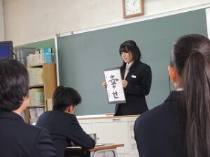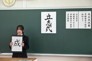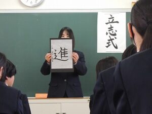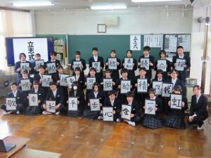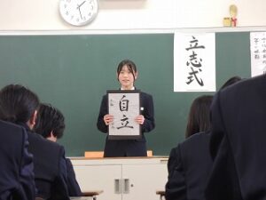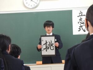 学校の様子PTA総会の日の授業参観で2年生が「立志式」を行いました。橋本佐内の「啓発禄」と呼ばれる「14歳の決意」について学び、自分の生き方について考えました。立志式では「どんな自分でいたいか」「何を大切に生きていきたいか」「今の自分のできる一歩は何か」を漢字に込め、自分なりの言葉で発表しました。大勢の保護者に見守られる中で、堂々と語る姿に感動を覚えると共に、次年度最高学年として全校をリードしてくれるであろうと期待が高まりました。