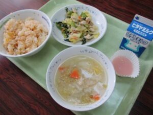 また今日は3年生のリクエストメニューのキムタクごはんを出しました。「キムチ」と「たくあん」の混ざったごはんということでこのネーミング。キムチチャーハンと並んでとても人気がありました。