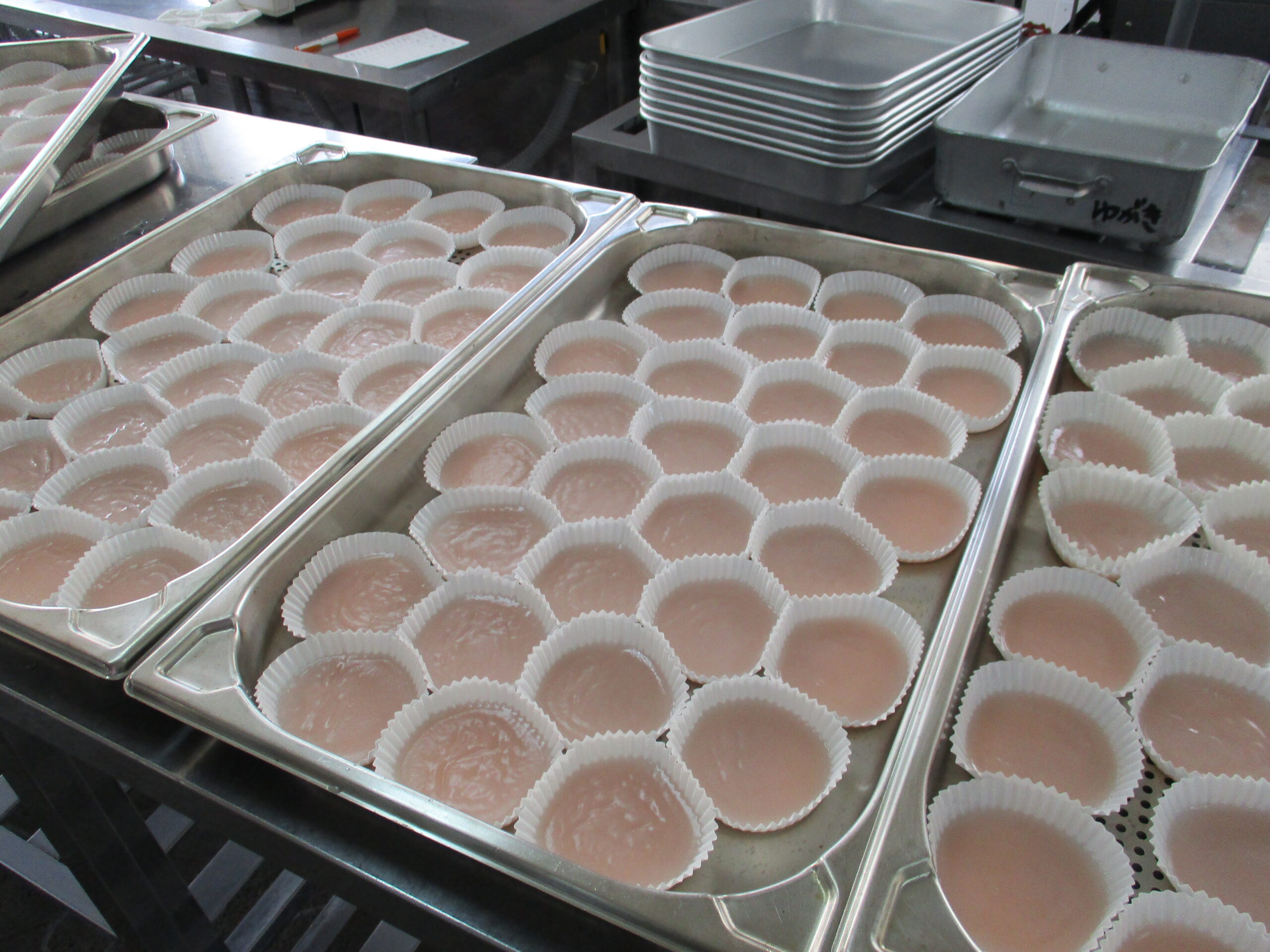 これには桜が使われているわけではなくて、桜のようなピンク色を付けただけのういろうなのですが、給食室では「桜」のような微妙な色になるようにみんなで真剣に考えながら色付をしていました。
