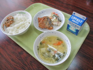3月に入ってからほぼ毎日3年生のリクエストメニューを給食献立に取り入れています。今週は「クリスピーチキン」「わかめごはん」「サイダーゼリー」が登場し、今日は「納豆みそ」「ポテトサラダ」「かきたま汁」を出しました。「かきたま汁」のようにごく普通のメニューに人気があるのは嬉しいことです。