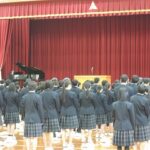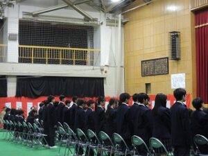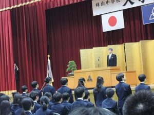 4月10日に、令和8年度入学式を挙行しました。あいにくの雨模様でしたが、新入生は目を輝かせ明るい表情で体育館に入場してきました。呼名では大きな声で返事をしたり、司会に合わせてきびきび行動したりしている様子から、頑張るぞという決意が伝わってきました。校長式辞では、いつでもどこでもだれとでもつながりを大切にしていこう、困ったことがあったらすぐに相談してほしい等が語られました。緊張と不安の中にある1年生たちはとても勇気づけられたことと思います。これから始まる中学校生活、紆余曲折あるかとは思いますが、一つ一つ乗り越えたくましく成長できるようサポートしていきたいと思います。