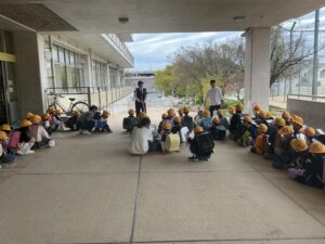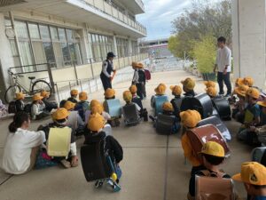 「自分の命は自分で守るために」雨の日でも車から目立ち易く交通事故を防ぐために交通安全協会や警察から贈呈されました。學年の代表が受け取りました。一人一人の名前を書いて、置き傘として学校に置いてあります。