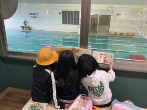 みんなコーチの言われることをしっかり聞いて頑張りました。欠席の人は、ギャラリーで本を読んだり、お友達の練習風景を見たりして過ごしました。