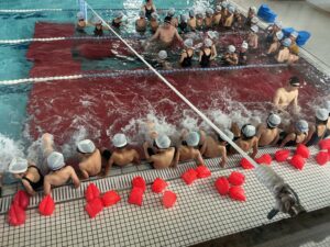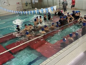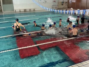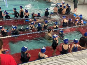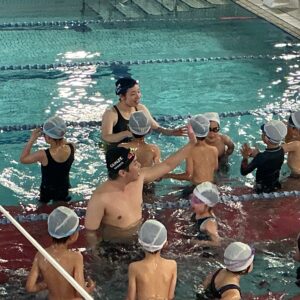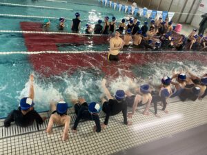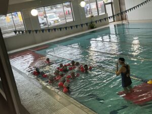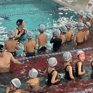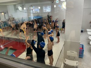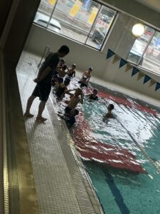 プールに着いたら、水着に着替えてまず体操をします。グループに分かれ早速練習です。