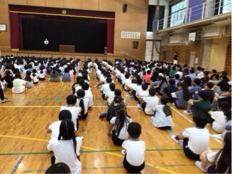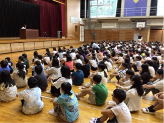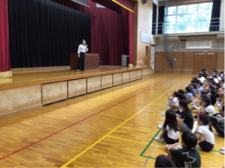 9月29日、学校朝会がありました。校長からスポーツフェスティバルに向けて、「練習を一生懸命取り組むこと」「失敗した人を見ても絶対に笑わないこと」などの話がありました。また、10月の学校だよりに、5月の体力テストの結果が載っていること、練習を通して色々な力を伸ばしてほしい、という話がありました。