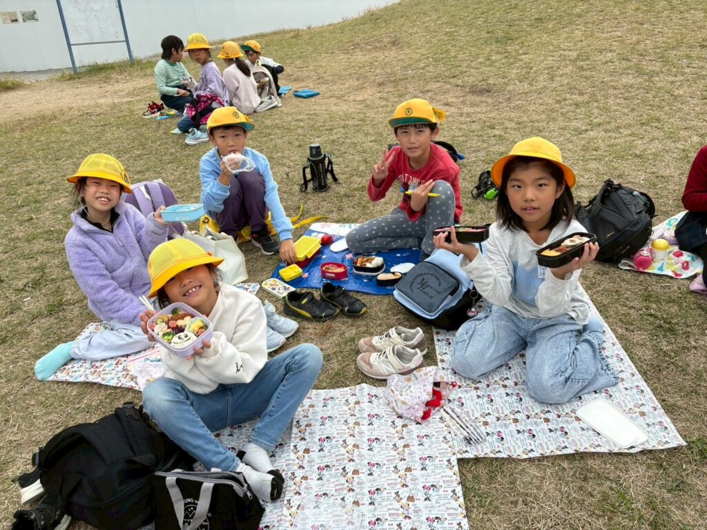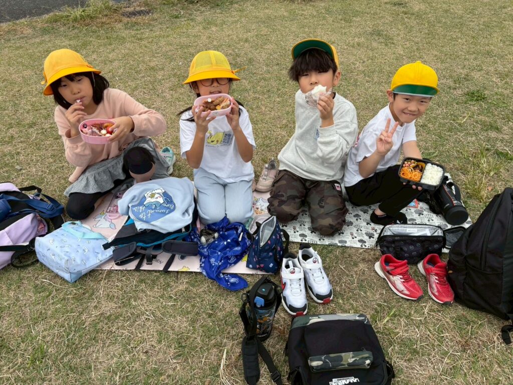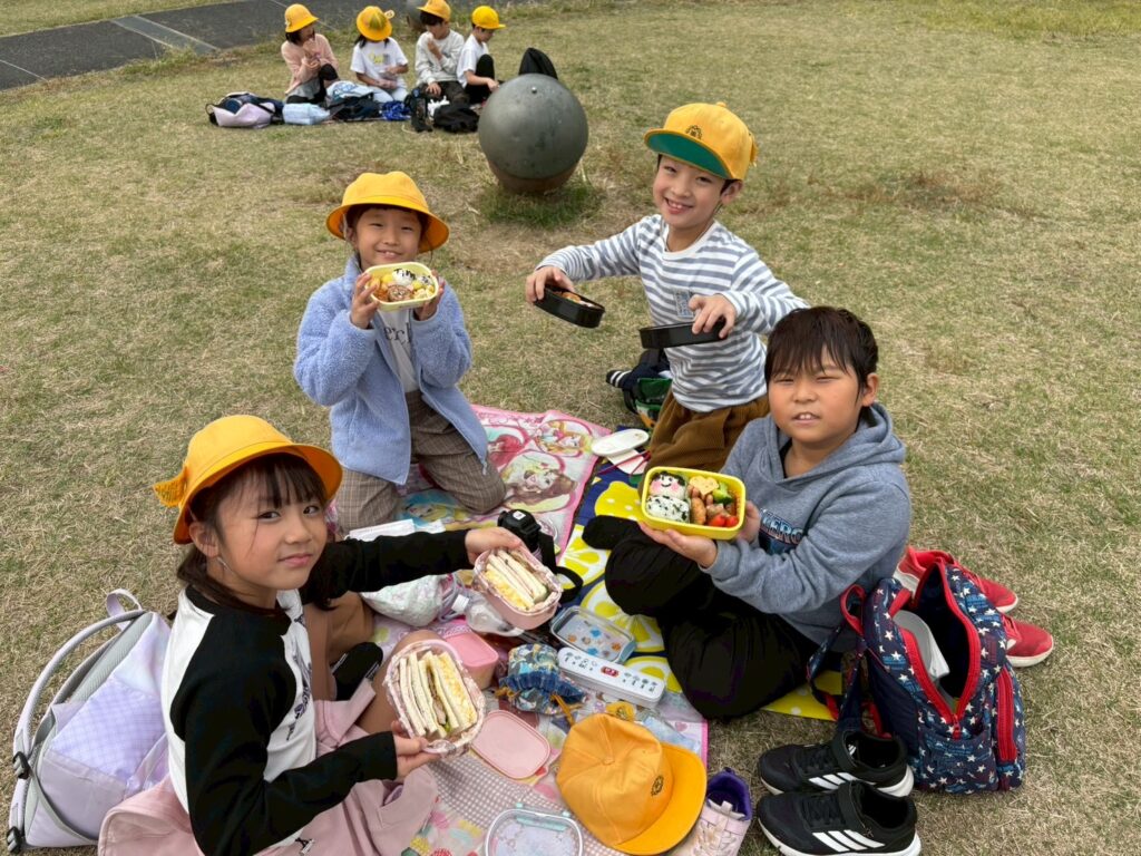 お昼は外に出て、お家の人が作ってくださったお弁当をいただきました。食べた後は、その公園でアスレチックで遊んでいます。