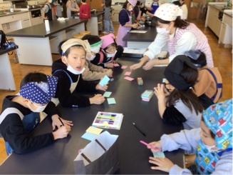 12月16日(火)自立活動の一環として、わかば学級が育てたお芋を使って大学イモを作りました。それぞれの発達課題に合わせて、お芋を切ったり炒めたり(これは先生がほとんど手伝いました)蜜を絡めて、お世話になった先生方へメッセージをつけてプレゼントしました。みんな楽しそうに作業していました。