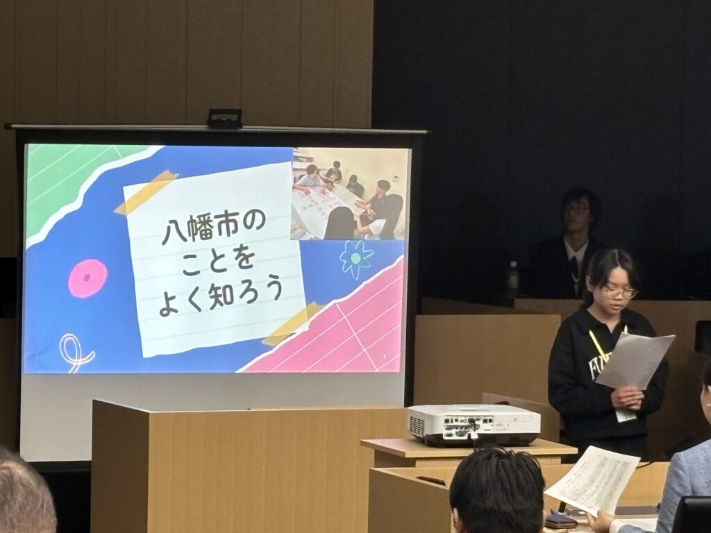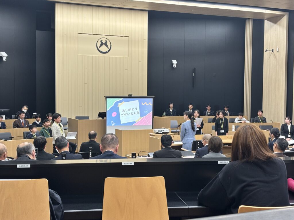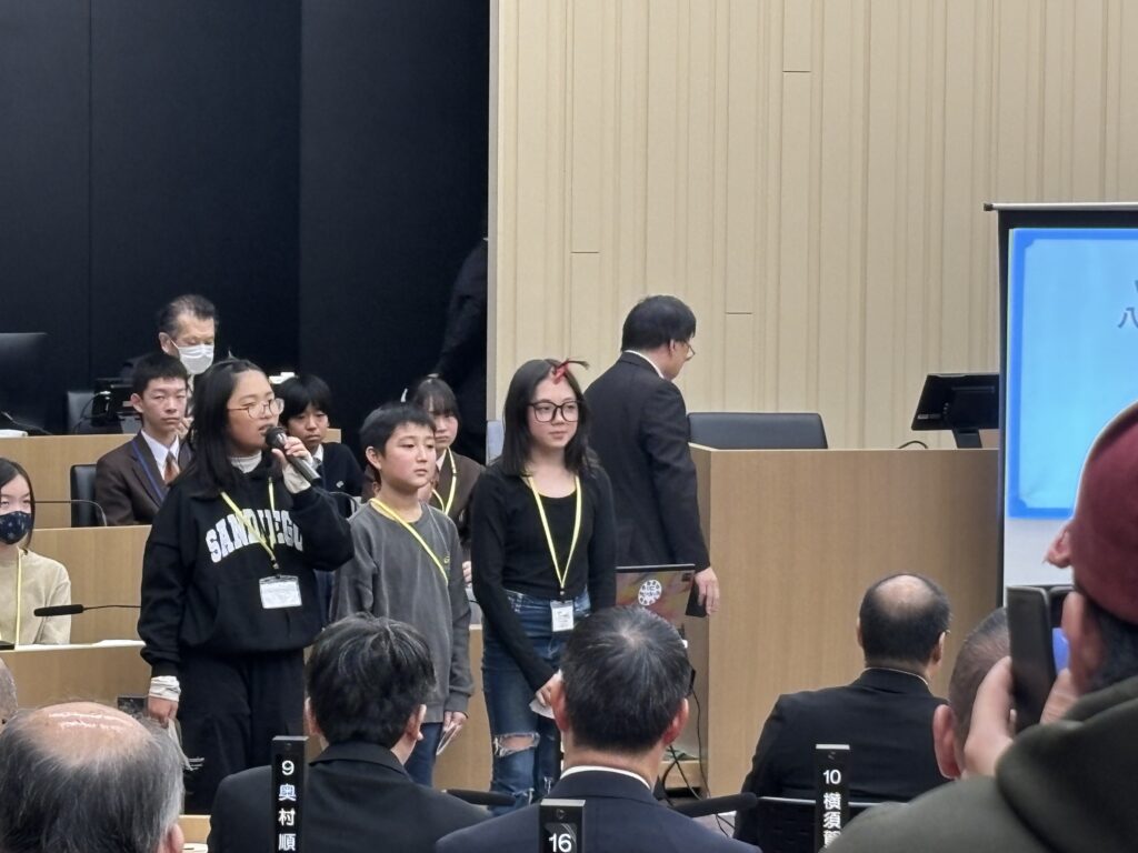 市長さんからの講評や議員さんからの質問にもしっかり考えて答えていました。週末に学校以外で集まって、体験したり話し合ったそうです。代表の2人は、「他の学校の人たちと会えてはなしあったりして楽しかった。」「良い経験になった。」と言っていました。