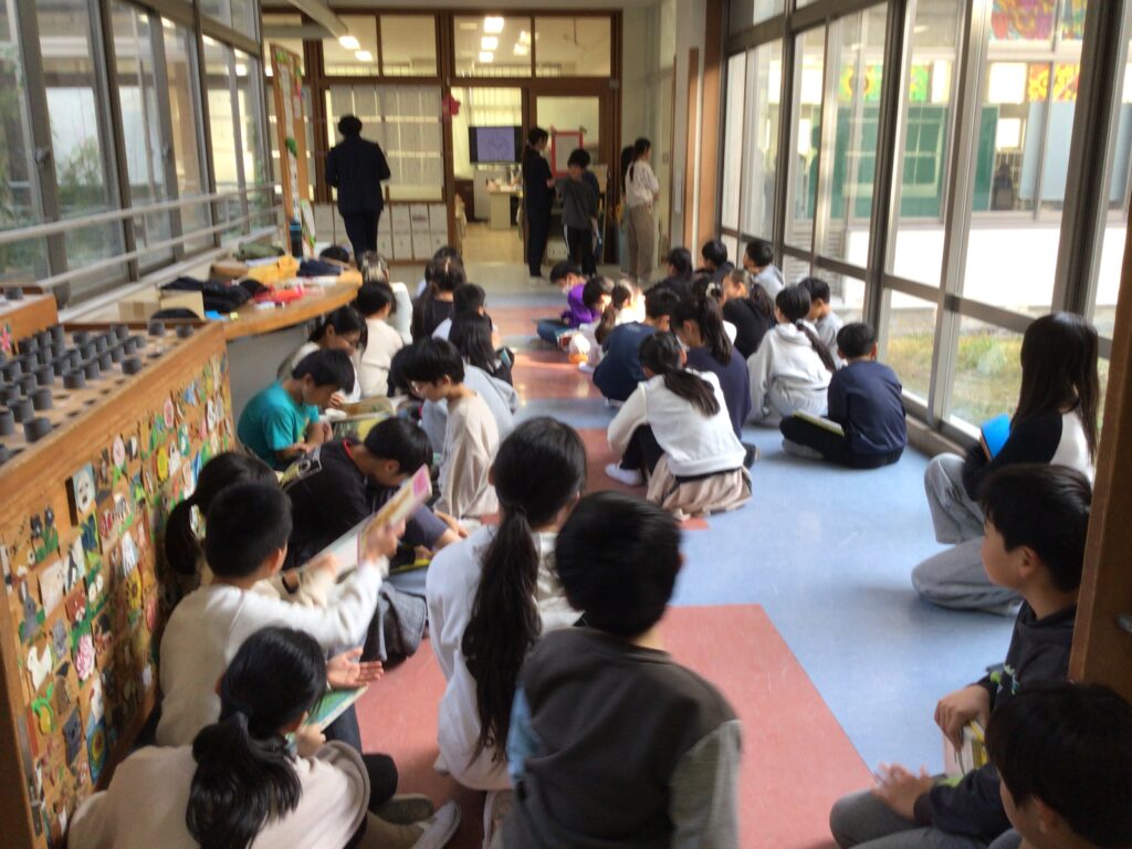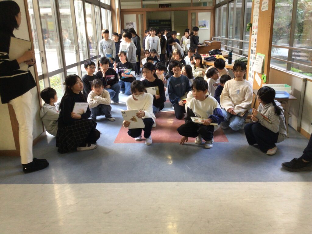 新1年生を廊下で待つ5年生。受付が終わった新1年生1人を5年生2人で担当します。絵本を読み聞かせて、体験入学が始まるのを一緒に待ちます。来年度6年生としての気持ちを味わう時間になりました。