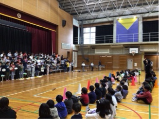 2月25日(水)の9:00〜より、学習発表会で発表できなかった3年生が全校と保護者の前で『生き生き生きる』というテーマで発表しました。『生き生き生きる』という詩を群読した後、『にじ』と言う歌を元気よく歌い、傘部隊がダンスを披露しました。また、スポーツフェスタで踊ったフラッグで『ライラック』を踊り、最後は初めて3年生で学習したリコーダーで『エーデルワイス』を演奏しました。