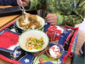 どのクラスも最後の給食を楽しそうに味わっていました。みんなで食べる給食は