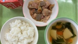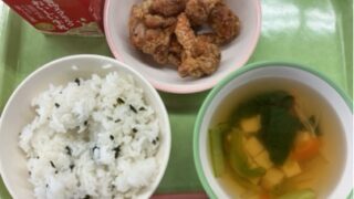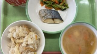 <今日の献立> 4月21日(火) ・筍ごはん ・鰆の塩焼き ・とうふのみそ汁 ・小松菜の胡麻和え ・牛乳 今日は、今が旬の八幡産の生の筍を使った筍ごはんでした。給食室でゆがいて油揚げを 入れて大きなガス釜で炊きました。とても美味しく...