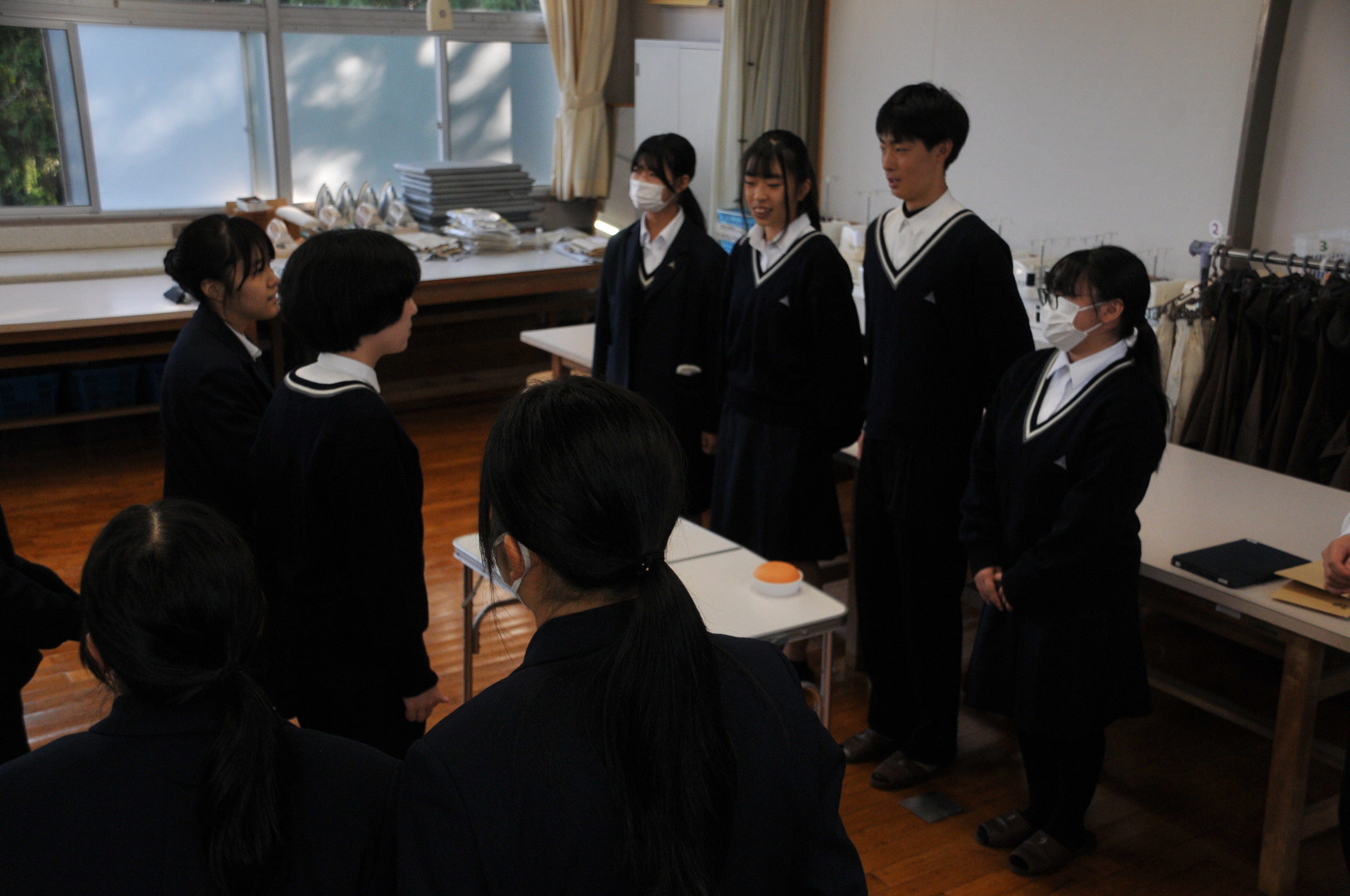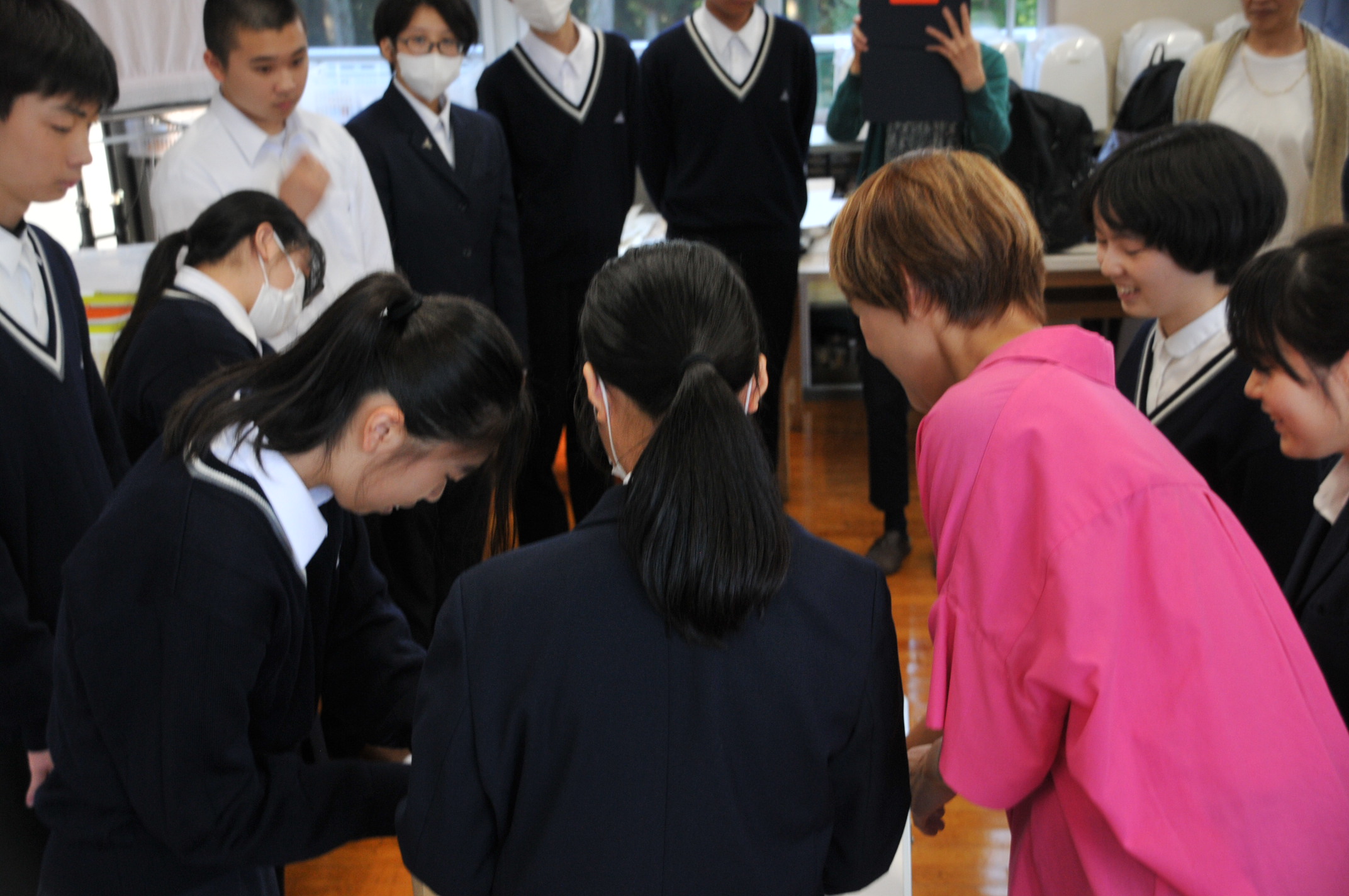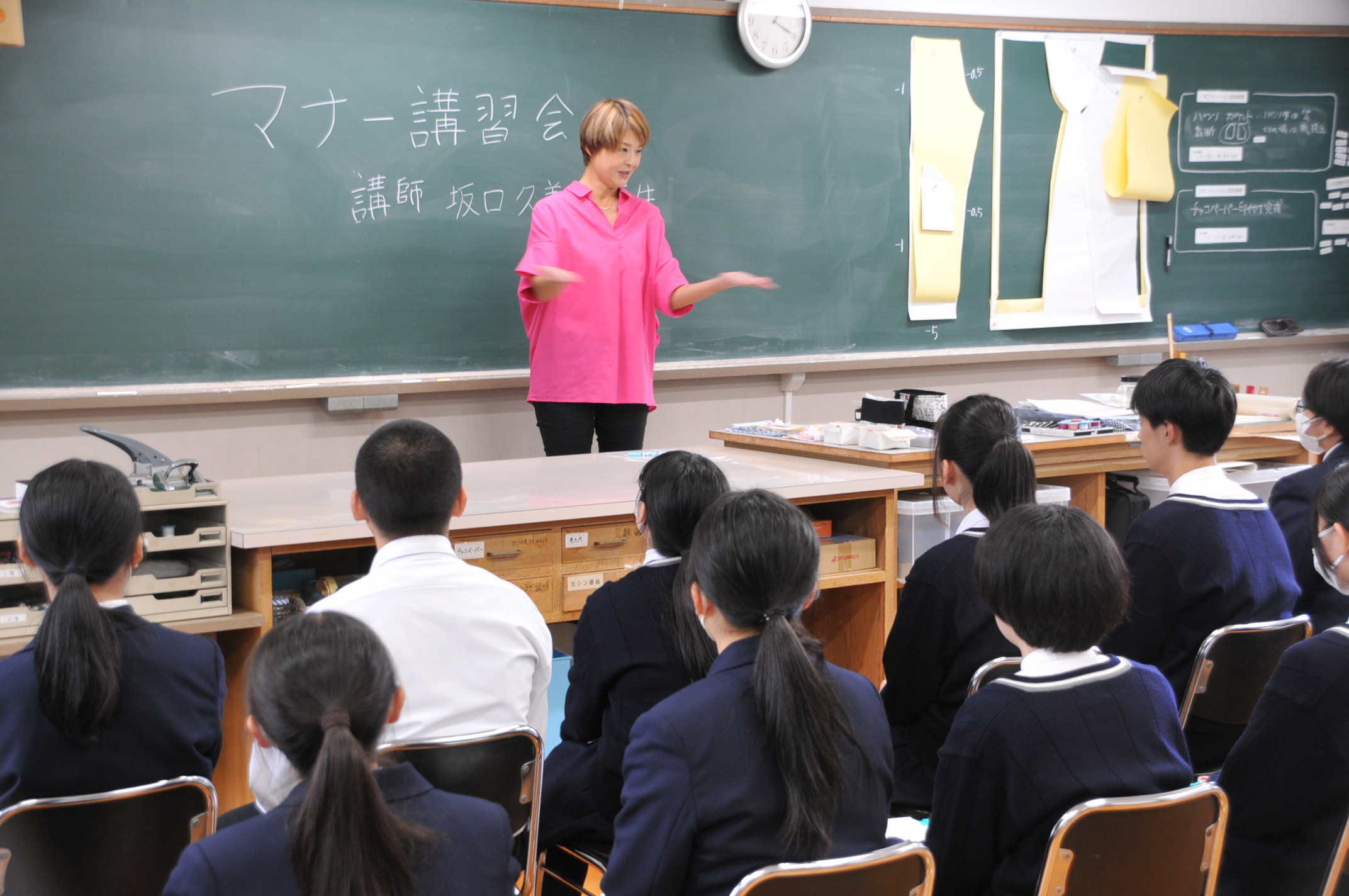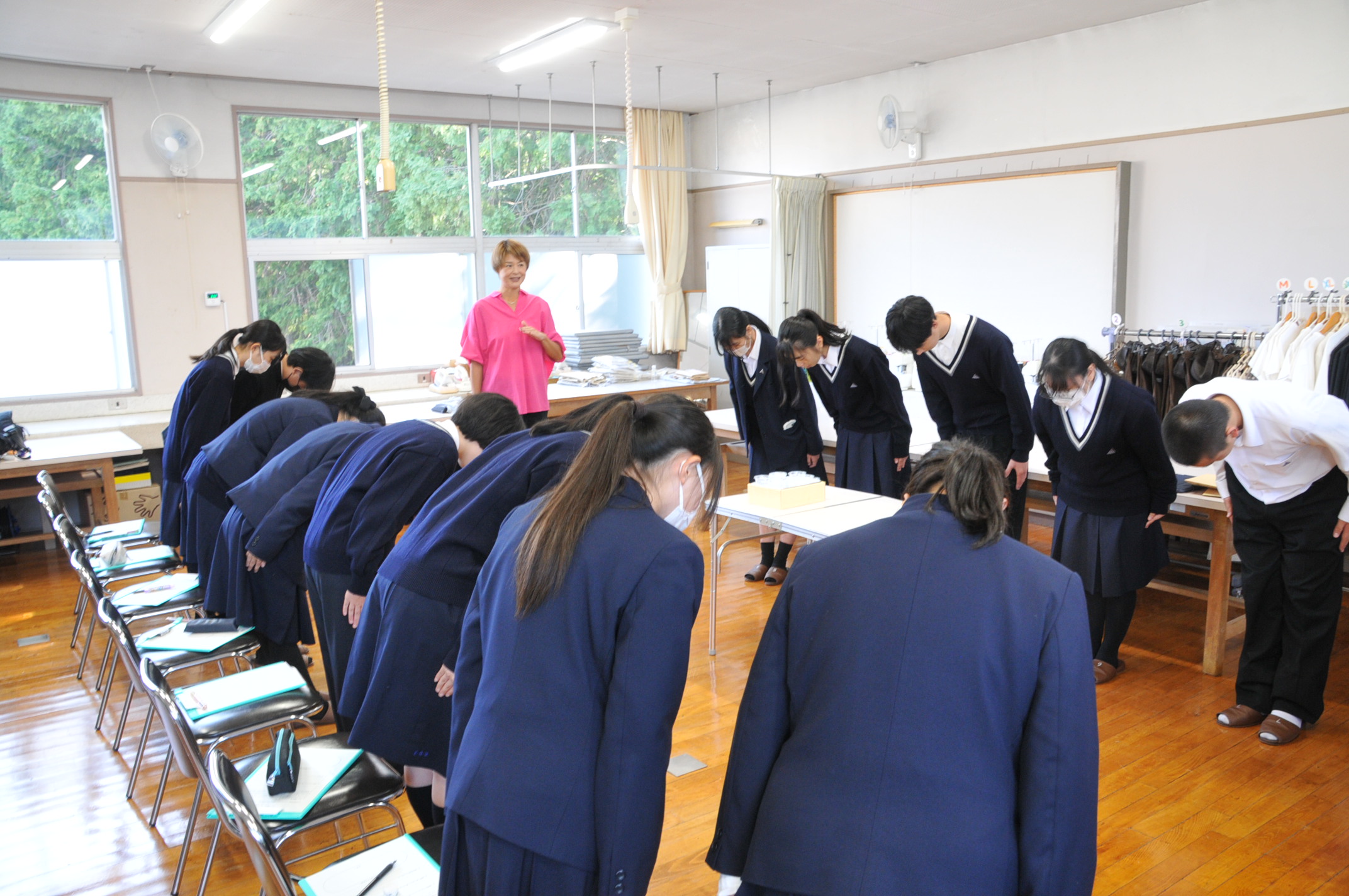 10月27日(月)には、毎年ファッションショー指導でお世話になっている坂口久美子先生に来ていただき、文化祭の販売マナーについて教えていただきました。生徒達はきれいな姿勢や笑顔の効果について話を聞き、その後、プリン販売のシュミレーションを行いました。文化祭当日の販売で実践してくれるのを楽しみにしています。