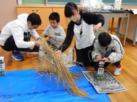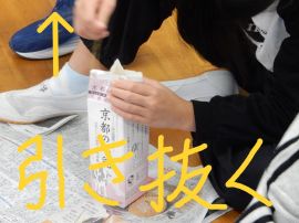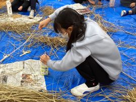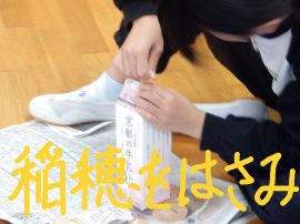 牛乳パックに穂先を挟み、パックの口を握って稲穂を引き抜きます。すると、そぎ取られた籾がパックの中に入るのです。一度にたくさん処理できないので時間は掛かりますが、面白いように取れました。穂先から籾が外れる時の「ズズズ」という感触が心地良かったです。子どもたちは、意欲満々で取り組み、あっという間に作業を終えることができました。