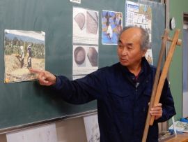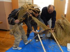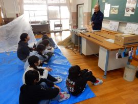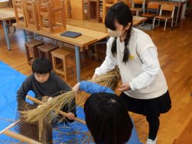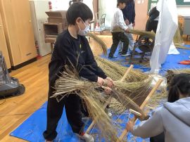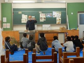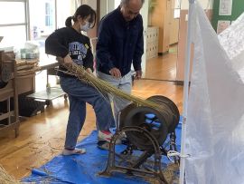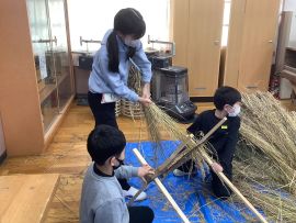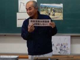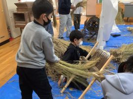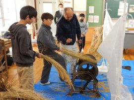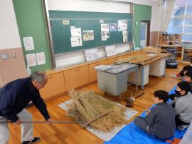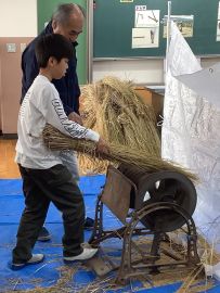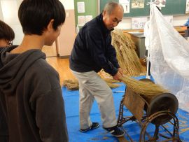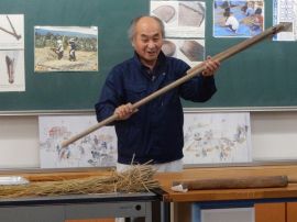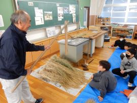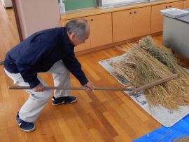吉田地域講師から、脱穀で使用する道具について教えて教えていただきました。木の棒の先にもう1本棒を取り付け、それを回転させて稲先を打って脱穀する「唐棹」を実演してくださいました。「楽しそう。」という児童がいましたが、作業効率が低いのが難点だということについて理解することができました。