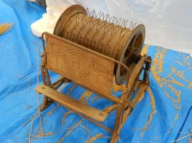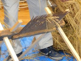 ・足踏み脱穀機…踏み板を踏んで、逆V字型の針金が付いたドラム(扱胴)を回しながら、稲先を押し当てて籾を弾き飛ばす機械。大正年間(1912~1926年)に発明された。