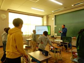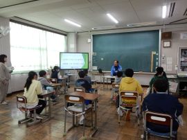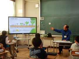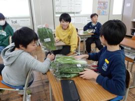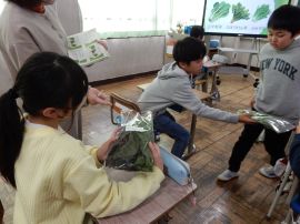 収穫前日の11月21日(金)に、「マメな中西農園」の中西代表、中丹東農業改良普及センターの儀間技師、中丹西農業改良普及センターの則信技師にご来校いただき、25日(火)の小松菜収穫に向けた事前学習を行いました。