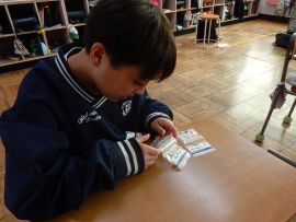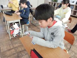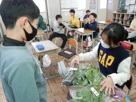 小松菜は、アブラナ科の植物で、年間約5回種まきから収穫を繰り返していると教えていただきました。中西さんが小松菜、春菊、わさび菜、スイスチャードなどの実物を持ってきてくださいました。また、小松菜、きゅうり、スイスチャードなどの種も持ってこられたので、実際に比較しながら学ぶことができました。種は、小松菜が一番小さかったです。定規でその大きさを測っている児童もいました。