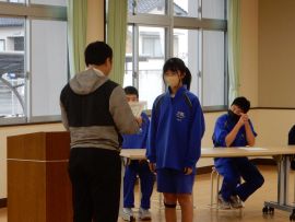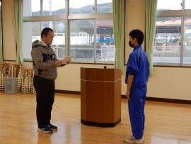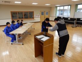 12月22日(月)に、新生徒会本部役員認証式・引継式のリハーサルを行いました。立ち位置や礼のタイミング、あいさつの仕方、認証状の受け取り方などなど…旧役員と新役員、顧問で入念に打ち合わせ、練習を行いました。
