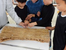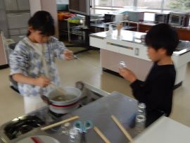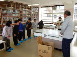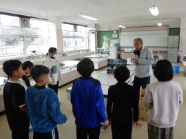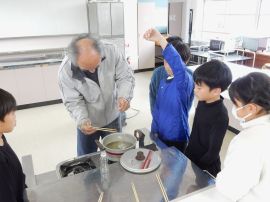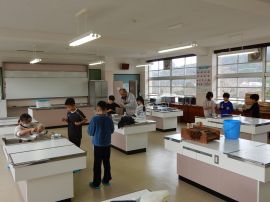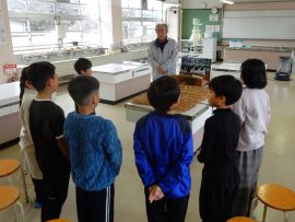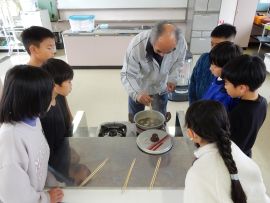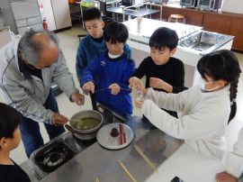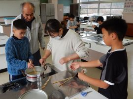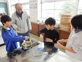 12月22日(月)に、4年生が三和創造学習の一環で、繭を蔟から外す「繭掻き(収繭)」と、繭から糸を繰って生糸にする「製糸」を行いました。講師は、今回も吉田地域講師です。