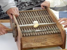取り外した繭には、毛羽がたくさん付いていました。昔は、毛羽が付いたままの繭は出荷できなかったので、「毛羽取り機」という道具を使い、「毛羽取り」をしました。これは、文字どおり、収繭した繭の毛羽を取り除く道具です。明治期に発明され、どんどん改良されていきました。今回使用したのは、昭和期のものでしょうか?台の上に置いた繭を毛羽除去棒の方へ送り、把手を時計回りに回すことにより、除去棒に毛羽を巻き取るという仕組みです。使ってみると、面白いように毛羽が取れました。この作業の後、使い終えた蔟を畳む体験もさせていただきました。