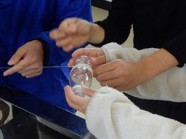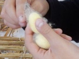 そして、いよいよ繭から生糸を紡ぐ「製糸」です。繭を熱湯に浮かべ、箸で転がしながら繊維を引き出し、それを縒って糸にし、錘にかけて巻き取っていきます。今回使用した錘は、ミニ・ペット・ボトルでした。「紡ぐ」という言葉がありますが、これは、名刺の「錘」が動詞化したものです。「言葉をつないで文章を作ること」にも「紡ぐ」を使います。