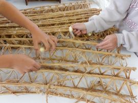 初めに、蔟から繭を取り外していく繭掻きを行いました。ちなみに、この時の蔟は、藁を組んで山型にした「改良折藁蔟」というもので、明治時代に発明されました。何が「改良」なのかというと、繭掻き作業が終わると、コンパクトに折り畳むことができ、何回も使用できるのです。
