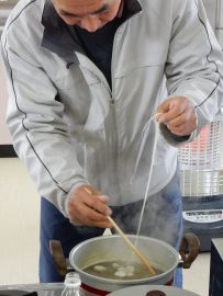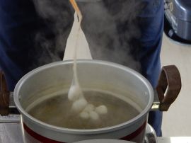 熱湯の入った鍋に繭を入れてかき回すと、少しずつ繭がほぐれていきました。繭を寄せるようにかき回していくと、自然に糸が引き出されてきました。子どもたちは、その糸の端を6~7本縒って、錘に巻き取っていきました。