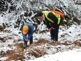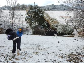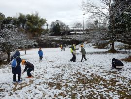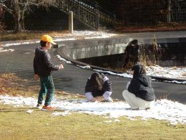 公園で雪合戦をしたり雪だるまを作ったりして、歓声を上げる子どもたちでした。小川にアメンボが泳いでいるのを発見し、興味深く観察する子もいました。