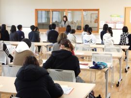 続いて各担当者から、中学校の教育課程、ルール、部活動などについて、「三和学園ガイド」をもとに説明をしました。終了後、技術室と音楽室に移動し、標準服や体操服、上靴、体育館シューズなどの採寸を行いました。