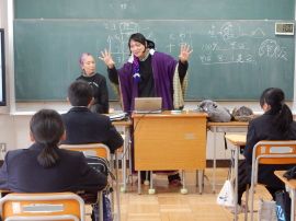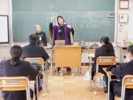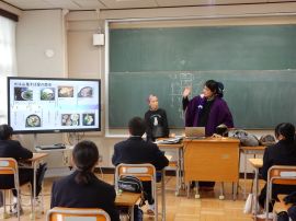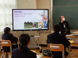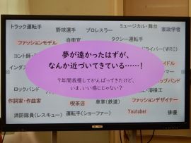 佐々井さんは、キャリア学習の一環だからと前置きされ、みんなが今やっている勉強は、全て上の学校や社会につながっていると、学ぶことの大切さを押さえられました。それに続いて、お二人の講師が自己紹介をされました。