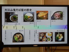 大江山鬼そば屋は、170年の歴史をもつそば屋です。中村さんは5代目、佐々井さんは7代目の店主です。お店のメニューは、季節によって変化しますが、50~70種類もあるというから驚きです。