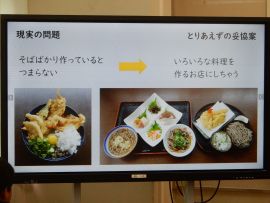 しかし、そば屋を継いではみたものの、「赤字の店でお金がない。」「そもそも自分は、そば屋になりたくはない。」「これまで経営の勉強をしてきていない。」…と、多くの問題が立ちはだかりました。そこで、やりたいことや、なりたいものへの道は我慢し、がんばるしかないと思ったそうです。佐々井さんは、これを「妥協」と言われていました。
