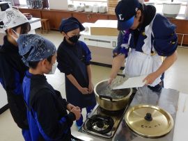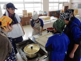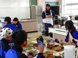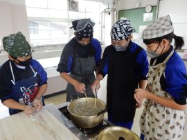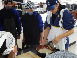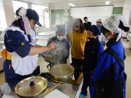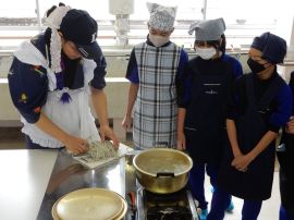 待ちに待った「頂きます」の時間です。気になるお味は…なるほど、こわい(硬い)麺です!でも、弾力がすばらしい!生徒たちは、「むちゃくちゃ美味しい!」と、何人もがおかわりをしていました。佐々井さんが、