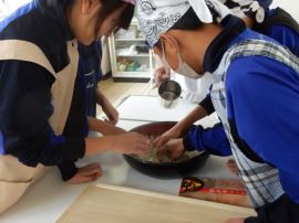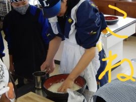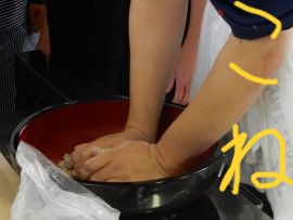 ここからは、生徒たちが体験していきます。まずは、「こね」です。サラサラのそば粉の感触を楽しんだら、水を混ぜてこねていきます。ちゃんと、指に力を込めて。