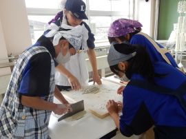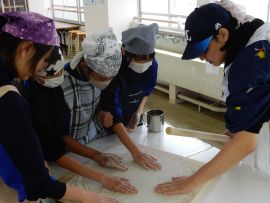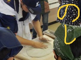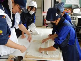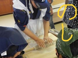 次は、「のし」です。まな板や麺棒にくっ付かないようにそば粉をまぶしながら作業をします。そして、厚さが均等に薄くなるように意識しながら、麺棒を使ってのしていきます。この「のし」が、最も難しかったように思います。佐々井さんのお手本のように広がっていかない上に、ひび割れが起きる班も…。佐々井さんのフォローにより、何とかまな板と同じくらいのサイズに広げることができました。