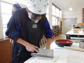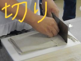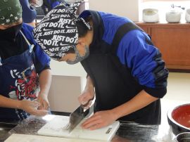 続いて、「切り」です。のした麺を折り重ねて、麺切り包丁を構えます。麺切り包丁は、中央部に近い部分を持ち、その重みを利用します。できるだけ太さが均一になるように、リズムよく切ることを注意しながら作業をしました。これも佐々井さんのように上手くいきませんでしたが、皆真剣に、思い切りをもって作業をしていました。