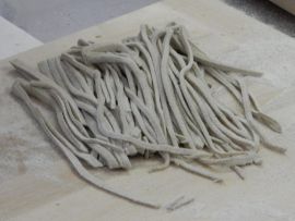 以上が茹でる前の段階までの作業でした。市販の麺や「二八そば」(小麦粉2割・そば粉8割のそば)と比べると少々太い麺ですが、これには理由がありました。そばは、元々が郷土料理であり、毎日何十食も手打ちで調理するとなると、この太さが「丁度良い」のだそうです。