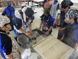 そば作りは、「挽き」「こね」「のし」「切り」「ゆで」の工程を経て完成します。7年生は、佐々井さんが朝に挽いてこられたそば粉を使い、「こね」の作業から行いました。