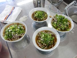 茹で上がったら、ざるでお湯を切り、ボウルへ移したら、楽しい盛り付けです。そして、中村さんが丹精込めて作られたつゆをかけて、刻みネギを乗せれば完了です!
