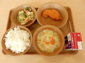 三日目は、平成17(2005)年の「2005年日本国際博覧会」(愛・地球博)にちなんだ愛知県に関わる献立、みそささ身カツ、れんこんサラダ、きしめんが出ました。