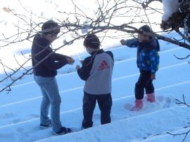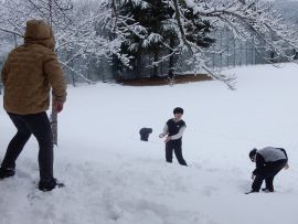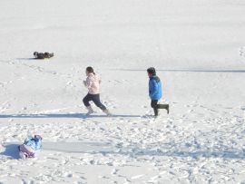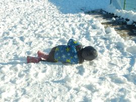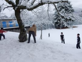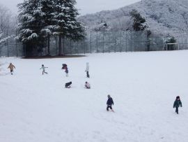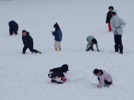 朝から1・2年生を中心に、多くの小学生が元気に雪遊びをする姿が見られました。スキー・ウェアを準備してきている児童は、思い切り雪にダイブしたり、斜面を転げたりしていました。かと思えば、全く雪の備えをしてきていない児童も、雪の魅力に抗えず(?)雪に埋もれながら素手で雪合戦をする姿がありました。つららを探したり、階段の上から雪にまみれたボールを投げてキャッチしたりするなど、思い思いに雪遊びを楽しんでいました。