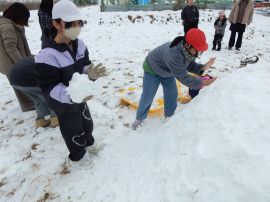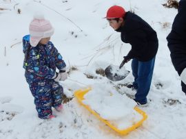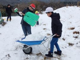 早速作業に取りかかりました。スコップで雪をすくい、三輪車へ。その雪をかまくらにくっ付けて、手で成形したり、足で踏み固めたりしました。園児たちと一緒に作業を進めていくうちに、どんどん本気になる5年生。かまくらを大きくするとともに、内側の雪をかき、よりドームに近い形にしていきました。