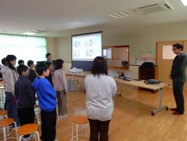 近年では、下の学年ほど新しく発売されたゲーム機の所持率が高いこと、その新しいゲーム機の便利な機能により、個人情報の流出につながる危険性があることを教えていただきました。その危険性とは、ボタン一つで12人とリアルタイムにメッセージのやり取りを行うチャットができること、ケーブルをつなぐと4人と顔を見ながらのテレビ・チャットができることです。これらにより、「見知らぬ人を部屋の中に招き入れている状態」となり、そこには補導員も警察官もいないので、大変危険なのです。だから、小さいきょうだいのいる人は、ゲーム機の使われ方をよく見て、注意をしてくださいと言われました。